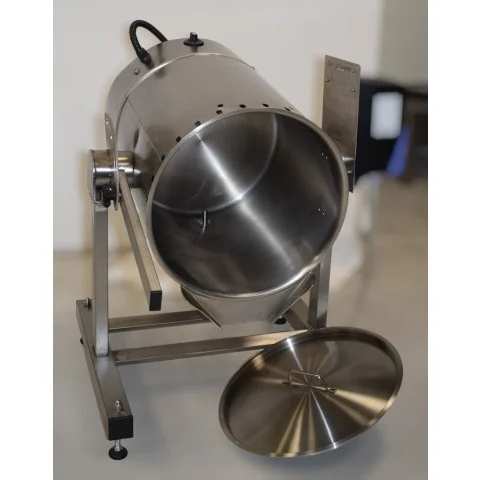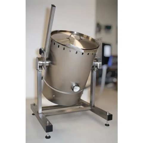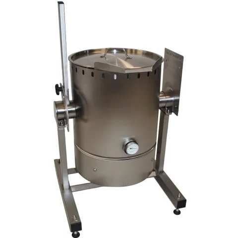 The basic version consists of an atmospheric working container with integrated electric bottom heating, installed on a free-standing stainless steel supporting structure, equipped with a thermometer, a tilt system for the working container, an upper lid and a 7-stage heating intensity regulator.