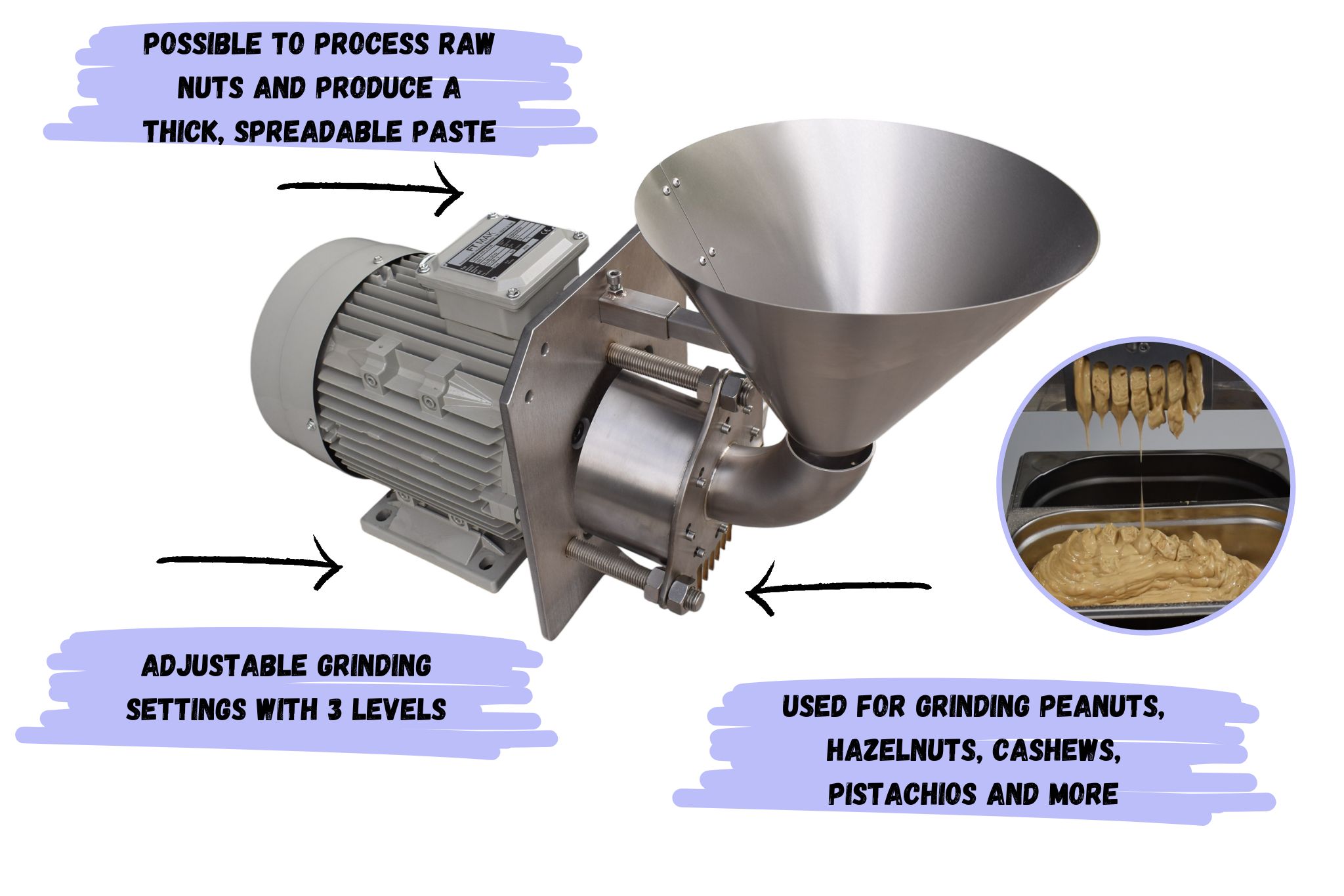 An essential solution for producing fruit purees and nut pastes/butters, whether on an industrial scale or in smaller production setups. Its compact design makes it ideal for use in professional kitchens. The colloid mill is perfect for creating a variety of nut creams, pastes, and oils, such as peanut butter, cashew butter, hazelnut paste, pistachio paste, urbecha, tahini, and more.