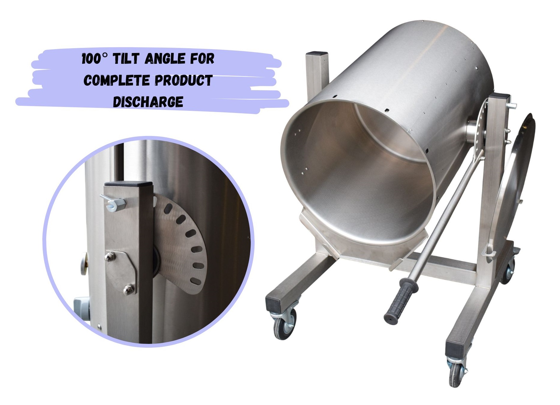 - Complete Emptying: A 100° maximum tilt angle allows for total product discharge, ensuring no residue is left behind and making cleaning easier.